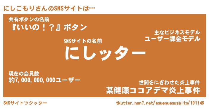 | 胡散臭い通販商品みたいなあだ名 | 『億万長者になれるブレスレット…その名も「にしこもり」』 |