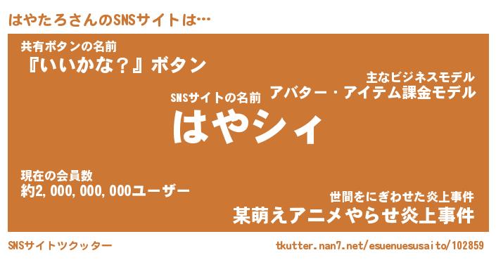 | 意味不明あだ名 | 『ペロリンはやたろ』『永久保存はやたろ』 |
