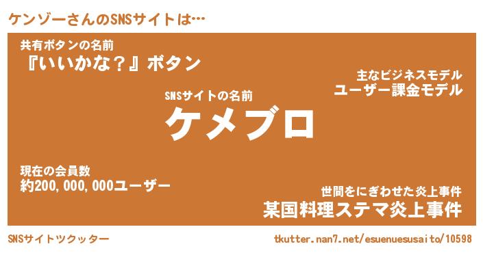| 意味不明あだ名 | 『ペロリンケンゾー』『永久保存ケンゾー』 |