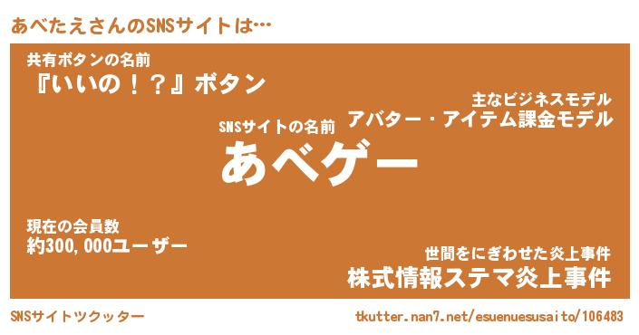| 肩書あだ名 | 『あべたえ社長』『あべたえ総理大臣』 |