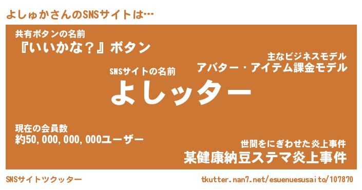 | 意味不明あだ名 | 『ペロリンよしゅか』『永久保存よしゅか』 |