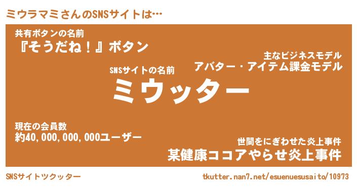| 胡散臭い通販商品みたいなあだ名 | 『億万長者になれるブレスレット…その名も「ミウラマミ」』 |