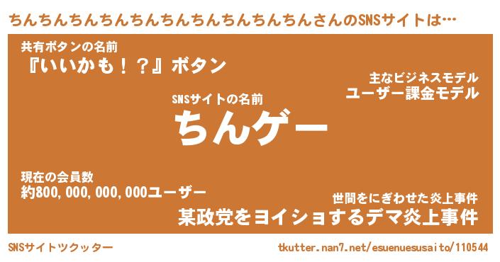 | 男性向けラノベタイトル風あだ名 | 『ちんちんちんちんちんちんちんちんちんちんの憂鬱』 |