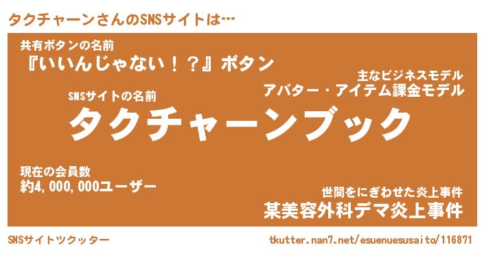 | ツイッター | タクチャーンさんのツイッターID『dendenmushi_man』 |