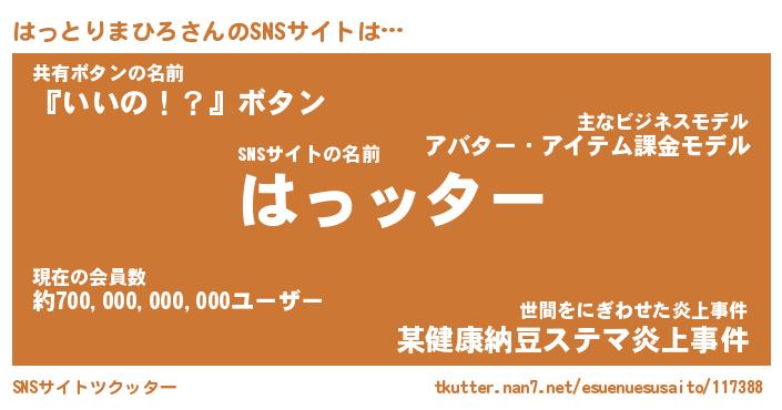 | 男性向けラノベタイトル風あだ名 | 『ハットリマヒロアートオンライン』 |