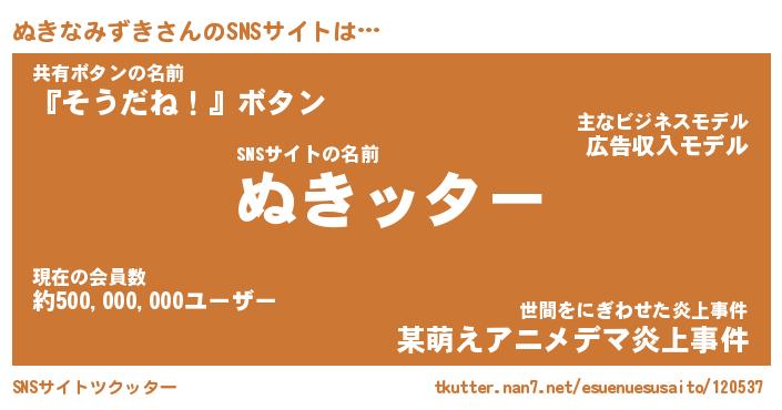 | 男性向けラノベタイトル風あだ名 | 『ヌキナミズキアートオンライン』 |