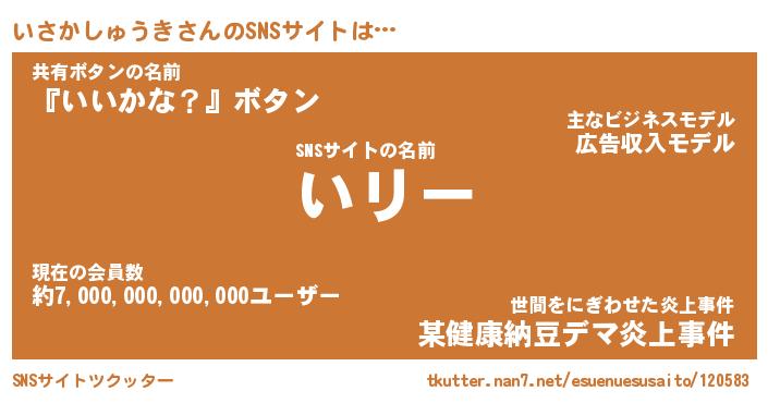 | 男性向けラノベタイトル風あだ名 | 『いさかしゅうきの憂鬱』 |