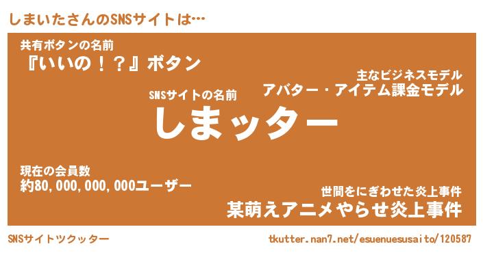 | 男性向けラノベタイトル風あだ名 | 『シマイタアートオンライン』 |