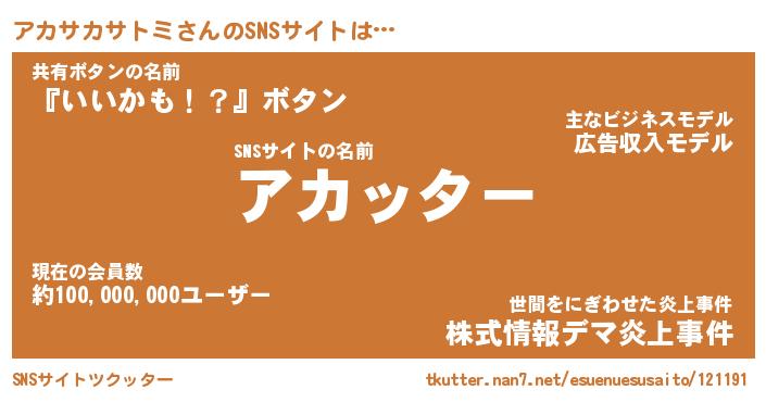 | 男性向けラノベタイトル風あだ名 | 『アカサカサトミアートオンライン』 |