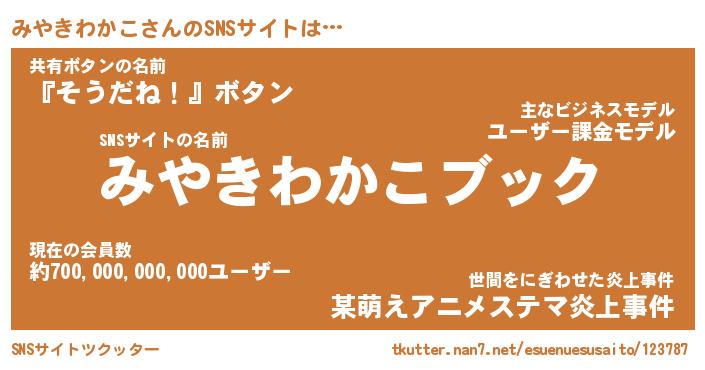 | 男性向けラノベタイトル風あだ名 | 『ミヤキワカコアートオンライン』 |