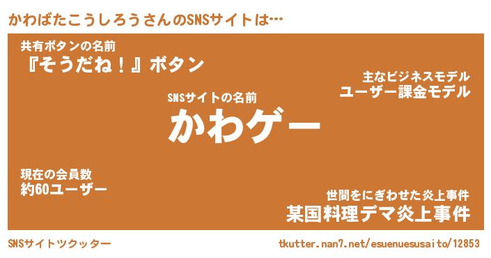 | ヒーロー風カッコイイあだ名 | 『スーパーカワバタコウシロウ』 |