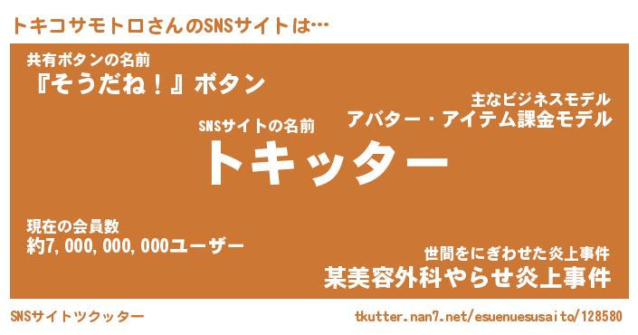 | 男性向けラノベタイトル風あだ名 | 『トキコサモトロアートオンライン』 |