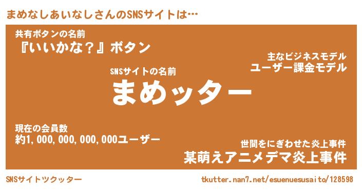 | 男性向けラノベタイトル風あだ名 | 『マメナシアイナシアートオンライン』 |