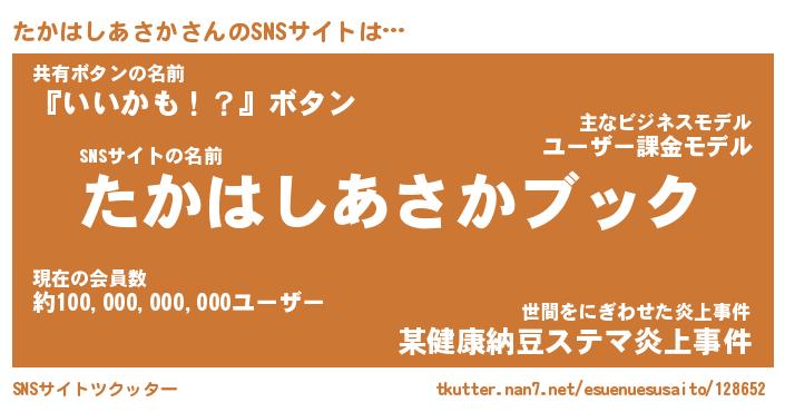 | 男性向けラノベタイトル風あだ名 | 『タカハシアサカアートオンライン』 |