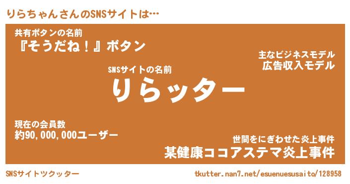 | ヘコむあだ名 | 『りらっふぃ~』『つくし』『りらを』 |