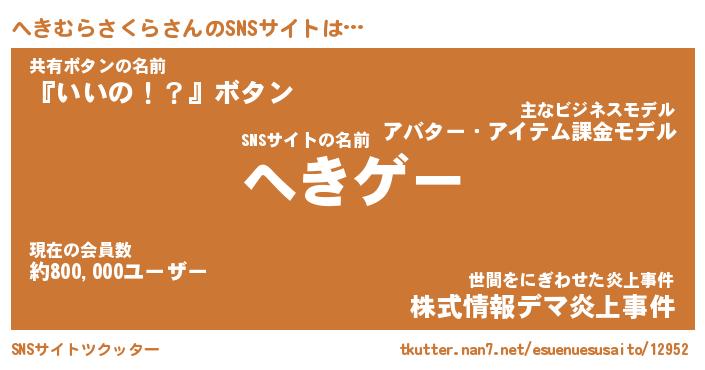 | 男性向けラノベタイトル風あだ名 | 『へきむらさくらの憂鬱』 |
