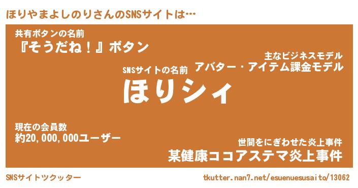 | ヘコむあだ名 | 『ほりにー』『豆乳』『ほり太郎』 |