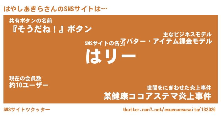 | 肩書あだ名 | 『はやしあきらCEO』『はやしあきら大統領』 |