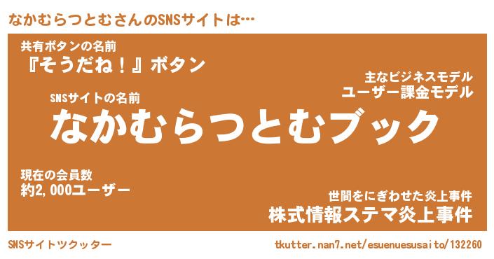 | 肩書あだ名 | 『なかむらつとむ御曹司』 |
