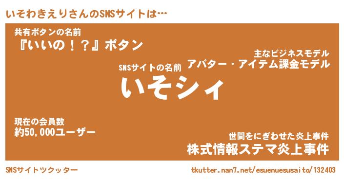 | ヒーロー風カッコイイあだ名 | 『スーパーイソワキエリ』『黄金騎士イソ』 |
