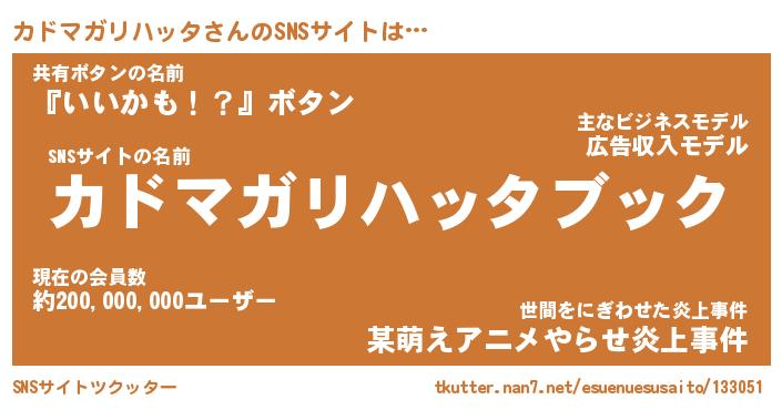 | 男性向けラノベタイトル風あだ名 | 『カドマガリハッタアートオンライン』 |