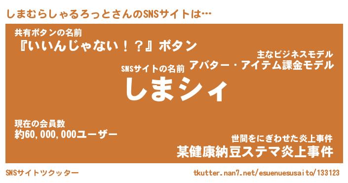 | 伝説のあだ名 | 『伝説のスナイパーしまむらしゃるろっと』 |