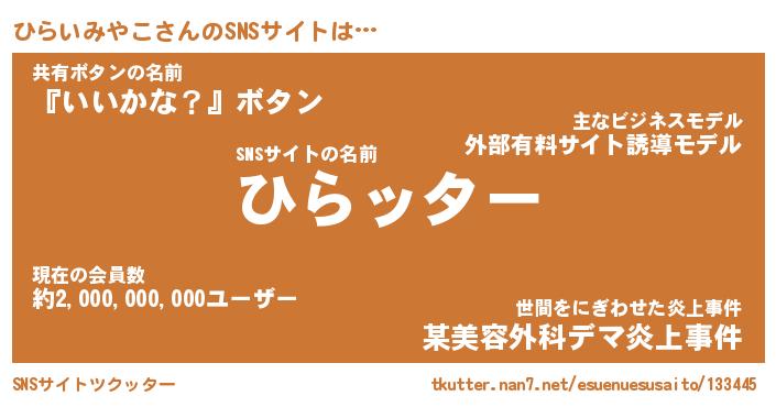 | 男性向けラノベタイトル風あだ名 | 『ヒライミヤコアートオンライン』 |
