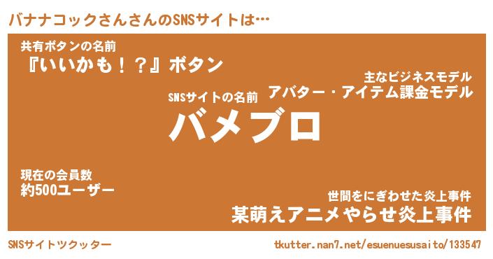 | 男性向けラノベタイトル風あだ名 | 『バナナコックサンアートオンライン』 |