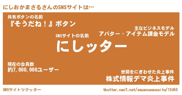 | 肩書あだ名 | 『にしおかまさる御曹司』 |