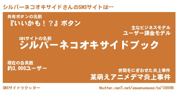 | 男性向けラノベタイトル風あだ名 | 『シルバーネコオキサイドアートオンライン』 |