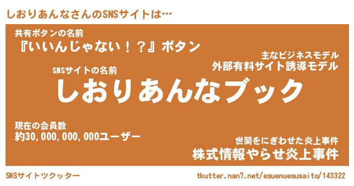 | 胡散臭い通販商品みたいなあだ名 | 『億万長者になれるブレスレット…その名も「しおりあんな」』 |