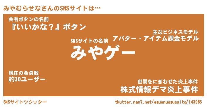 | ヒーロー風カッコイイあだ名 | 『スーパーミヤムラセナ』『暗黒騎士ミヤ』 |