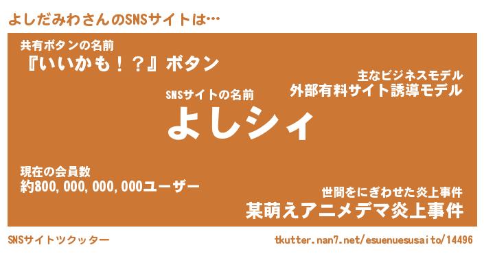 | ファンタジー風あだ名 | 『ヨシフェル』『エターナルヨシダミワー』 |