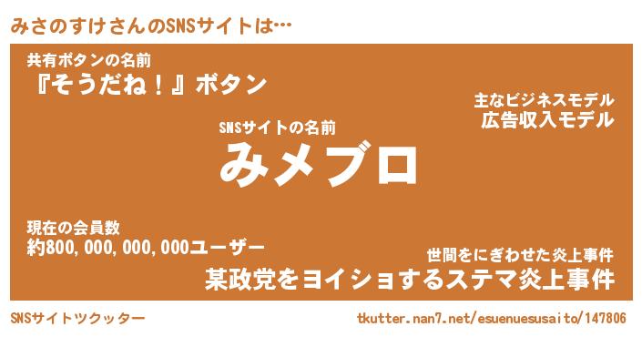 | 肩書あだ名 | 『みさのすけ社長』『みさのすけ総理大臣』 |