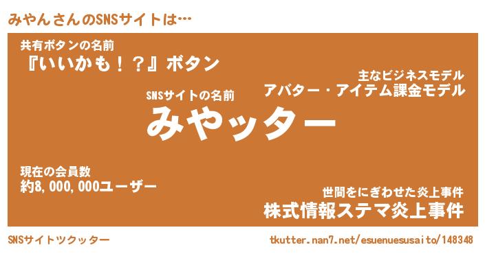 | ヘコむあだ名 | 『みやにゅー』『酢こんぶ』『みやを』 |