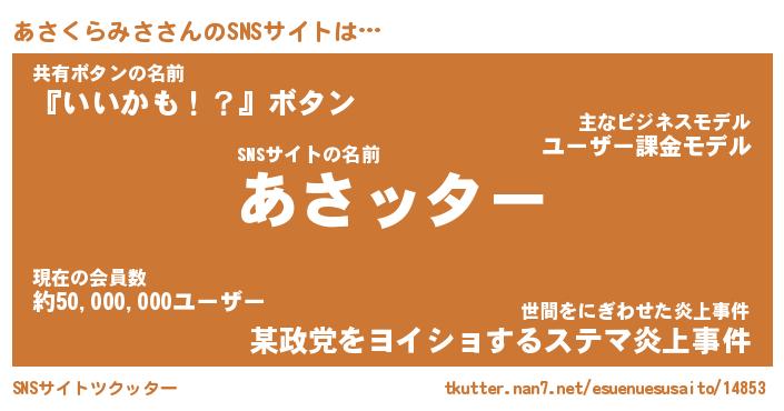 | 胡散臭い通販商品みたいなあだ名 | 『億万長者になれる霊験あらたかなお札…その名も「あさくらみさ」』 |