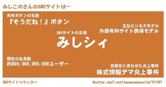 | 胡散臭い通販商品みたいなあだ名 | 『必ず成功する霊験あらたかなお札…その名も「みしこの」』 |