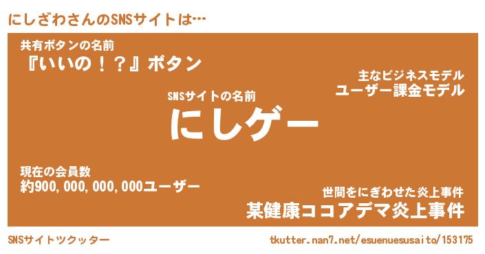 | 肩書あだ名 | 『にしざわCEO』『にしざわ総理大臣』 |