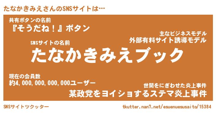 | 肩書あだ名 | 『たなかきみえCEO』『たなかきみえ大統領』 |