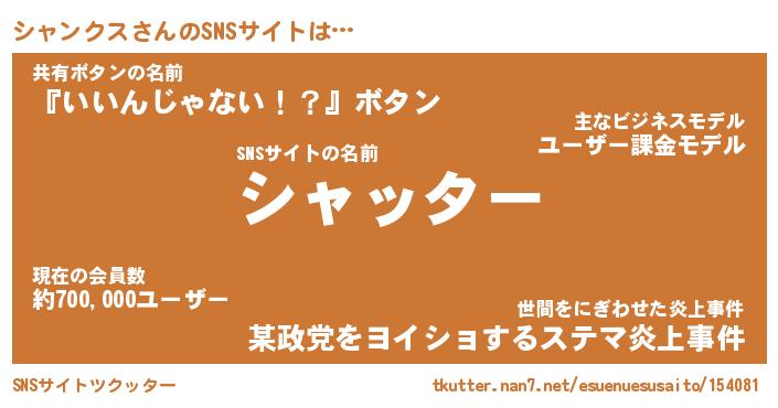 | 肩書あだ名 | 『シャンクス社長』『シャンクス大統領』 |