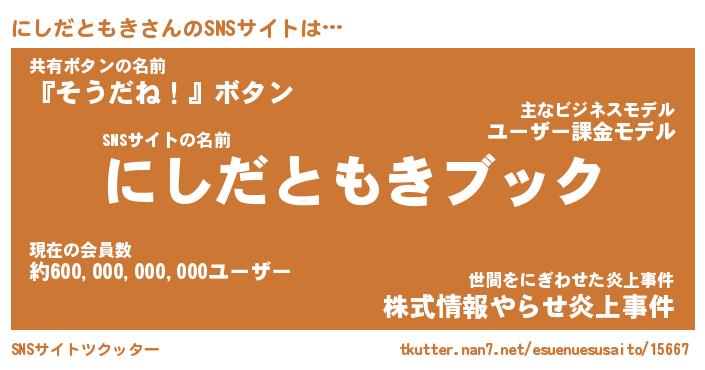 | 男性向けラノベタイトル風あだ名 | 『ニシダトモキアートオンライン』 |