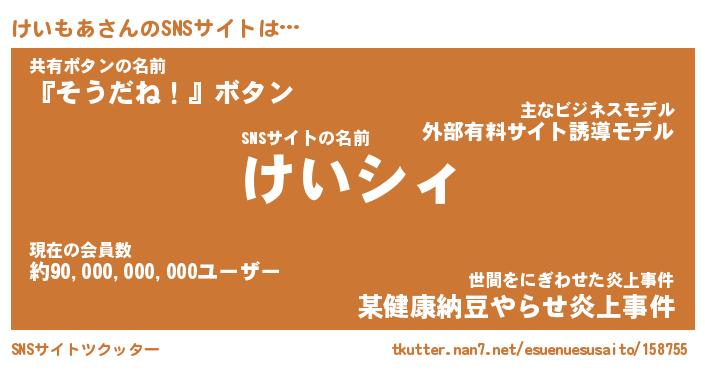 | 意味不明あだ名 | 『ペロリンけいもあ』『永久保存けいもあ』 |