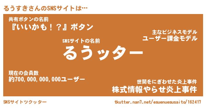 | 胡散臭い通販商品みたいなあだ名 | 『億万長者になれるブレスレット…その名も「るうすき」』 |