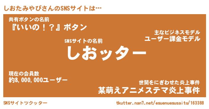| 男性向けラノベタイトル風あだ名 | 『シオタミヤビアートオンライン』 |