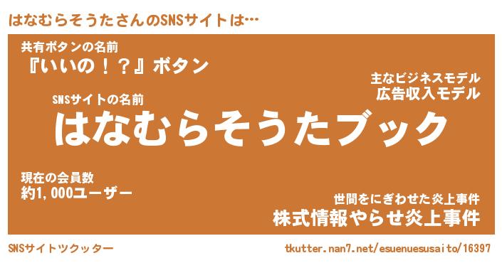 | 男性向けラノベタイトル風あだ名 | 『ハナムラソウタアートオンライン』 |