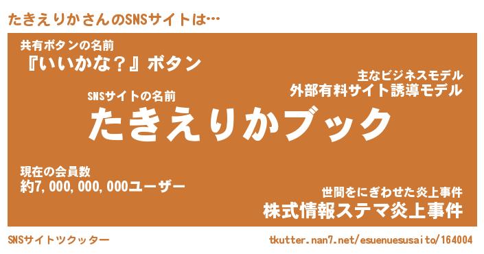 | 胡散臭い通販商品みたいなあだ名 | 『億万長者になれるブレスレット…その名も「たきえりか」』 |