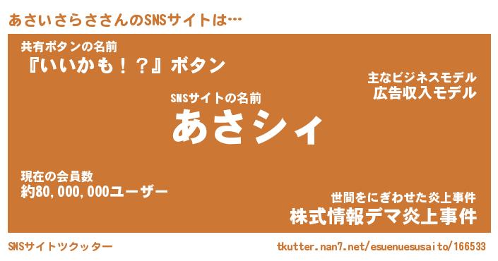 | 肩書あだ名 | 『あさいさらさCEO』『あさいさらさ教頭』 |