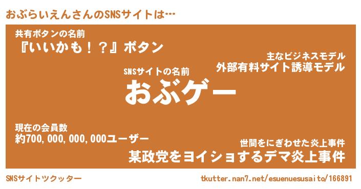 | 男性向けラノベタイトル風あだ名 | 『おぶらいえんの憂鬱』 |