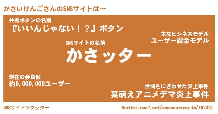 | 男性向けラノベタイトル風あだ名 | 『カサイケンゴアートオンライン』 |