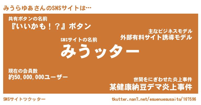 | 胡散臭い通販商品みたいなあだ名 | 『億万長者になれる霊験あらたかなお札…その名も「みうらゆあ」』 |